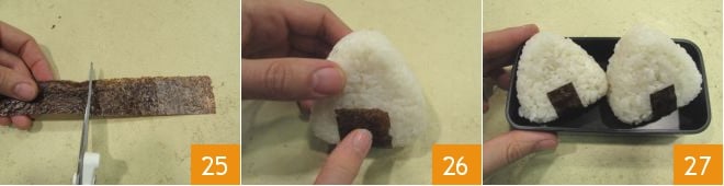 and 5 cm long 25. Attach the obtained strips to the base of each onigiri, pressing on the rice until they stick on their own 26. Your onigiri are ready to be enjoyed 27!