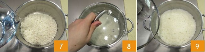 add 600 g of water 7, cover with a lid 8 and bring to a boil over medium heat. When the water comes to a boil, lower the heat to the minimum and cook the rice for about 12-13 minutes, always with the lid on. After this time, check that the rice has absorbed all the water 9, then turn off the heat and let the rice rest in the pot with the lid on for another 10 minutes.