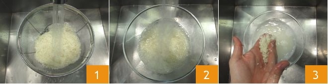 To make the onigiri, start by preparing the rice: place the rice in a sieve and rinse it well under running water 1, then transfer it to a bowl and fill it with water 2. Rub the rice grains together with your hands 3,