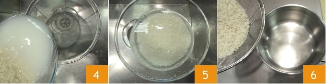 then change the water in the bowl to remove the released starch 4 and repeat the same operations until the water is clear 5. At this point, pour the rice into a saucepan 6,