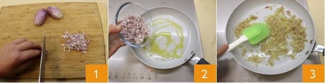 To make the open lasagna with salmon, grilled zucchini, and eggplants, start by preparing the béchamel. Finely chop the shallot 1, stew it for 10 minutes over low heat in a non-stick pan with a drizzle of oil 2, stirring well with a spatula; when the shallot is ready, turn off and set aside 3.