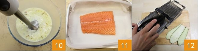 Blend the béchamel with an immersion blender until smooth and homogeneous and set aside 10. Take the salmon, run your fingertips over the flesh to check for any bones (remove them with kitchen tweezers if necessary), then place it in a baking sheet lined with parchment paper 11; bake in a preheated static oven at 340°F for 10 minutes (or at 300°F for 7-8 minutes if in a fan oven) and in the meantime get the vegetables ready. Wash the eggplants and zucchinis thoroughly under cold running water and then use a mandoline to slice them thinly 12.