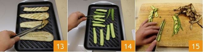 Grill the eggplants 13 and zucchinis 14 on a well-heated grill, turning them on both sides. When finished, cut the grilled vegetables in half, which you will then use to fill the mini lasagnas 15.
