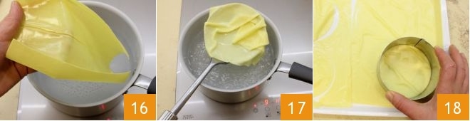 Put a pot of salted water on the heat with a drizzle of oil and bring to a boil to briefly cook the lasagna sheets: cook each sheet for about 3 minutes 16, then drain with a slotted spoon 17 and place the pasta on a tray. Use a round cutter to cut out circles with a diameter of 4 inches 18.