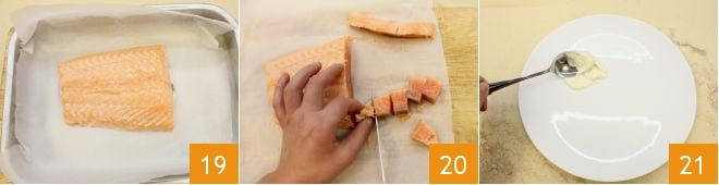 When the salmon is cooked 19, let it cool, then cut it into cubes measuring 3/4 inch by 3/4 inch 20. Now, assemble the layers of the mini lasagna on a serving plate, starting with a spoonful of béchamel 21.