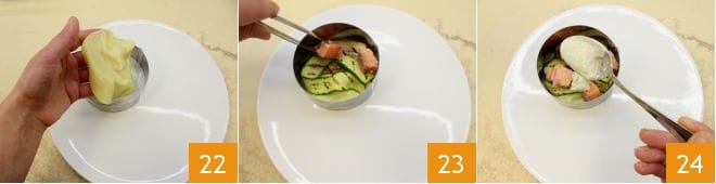 With the help of the round cutter, place a layer of pasta sheet 22, then add the grilled vegetables, 4 pieces of cubed salmon 23, and finally another teaspoon of béchamel 24.
