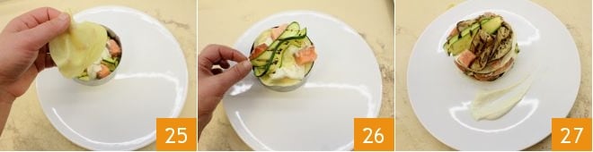 Continue alternating the ingredients to create more layers 25, reserving some béchamel for decoration, and finish without covering with pasta 26; once assembled, remove the round cutter, garnish as desired with the remaining béchamel, then serve and enjoy the open lasagna with salmon, grilled zucchini, and eggplants 27.