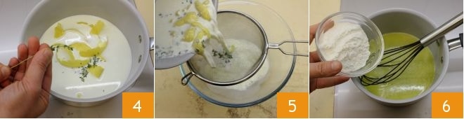 In a pot, bring the milk, lemon zest, and thyme leaves to a boil 4, then strain the mixture through a sieve 5. In another small pot, melt the butter cut into pieces, add the flour 6, and heat the mixture to create the roux;