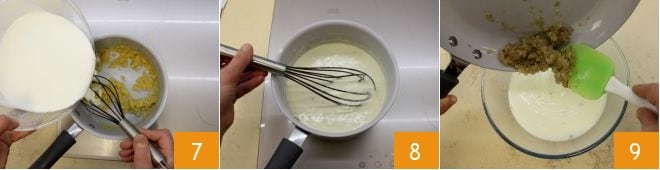 incorporate the strained milk 7 and stir with a whisk; continue cooking until the sauce has thickened 8 while stirring quickly, then turn off the heat. At this point, place the béchamel in a bowl and add the stewed shallots 9.