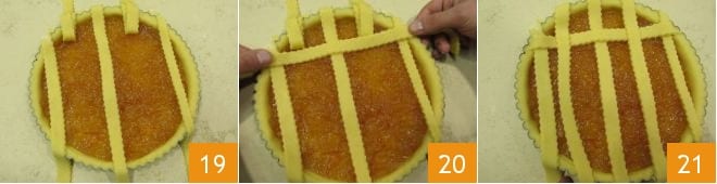Lift again, this time the first strip, the third, and the last one 22 and lay another one horizontally 23; proceed by folding the vertical strips over the tart and continue with this technique to finish all the strips 24.