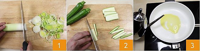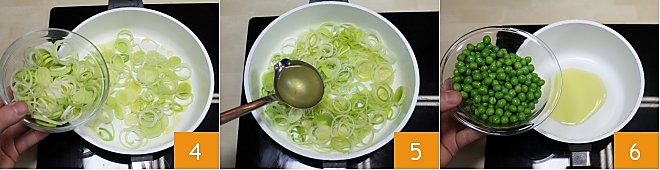 and add the leeks 4 and let them cook, pouring in a ladle of vegetable broth to extend the cooking time 5. In another smaller pan, add a tablespoon of olive oil and add the peas 6,