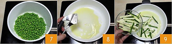 let them cook for 15 minutes 7, and again add the ladle of broth and let them cook for a few more minutes. The peas should remain bright green and rather crunchy. In another pot, add the remaining oil and crush the garlic clove 8. Add the zucchini to the oil and let it cook for a few minutes 9,