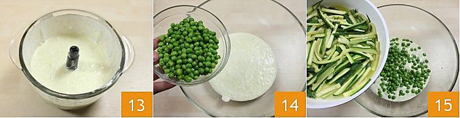 and blend everything until you get a smooth cream 13. In a bowl, pour the yogurt cream, the peas 14, the zucchini 15, add salt and pepper