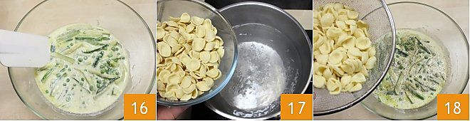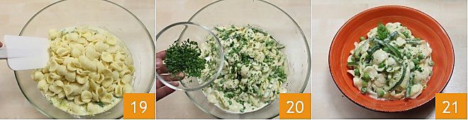 and mix everything well 16. Then boil the orecchiette in plenty of salted water 17, once the pasta is cooked, pour it into the bowl 18 along with the yogurt cream and vegetables,