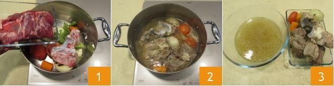To make the ossobuco with peas, start by preparing the Beef Broth: wash and peel the vegetables and place them in a large, high-sided pot with the oil. Season with whole peppercorns and cloves. Add the meat 1 and cover with 3 quarts of water. Let it cook over medium-high heat for about 2 hours, until the broth reduces by about half. Then add the remaining quart of water and let it cook for another hour over low heat. At the end of cooking 2, strain the broth through a fine-mesh sieve 3.
