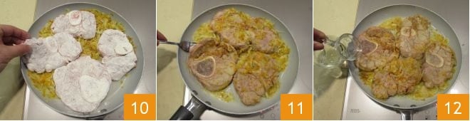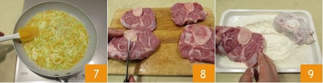 and let them soften over moderate heat for about 10-15 minutes 7. Take the ossobuco cuts and use kitchen scissors or a knife to cut the membrane surrounding them 8; this will prevent the meat from curling during cooking. Flour the ossobuco cuts on both sides 9