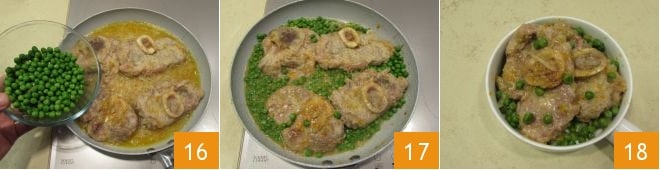 Occasionally move the pan back and forth to prevent the ossobuco from sticking, and if it becomes too dry, add more broth to the preparation. About 10 minutes before cooking ends, add the peas 16. If in season, use fresh peas in the same amount, making sure to cook them longer. Your ossobuco cuts are ready 17, serve them hot 18!