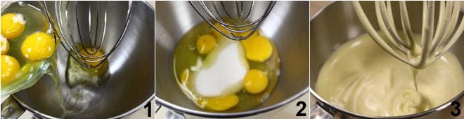 To prepare the Sponge Cake with rice flour, start by placing the room temperature eggs in a stand mixer 1, then add the sugar 2 and whisk the ingredients for at least 10/15 minutes until you obtain a frothy, fluffy, and light yellow mixture 3.