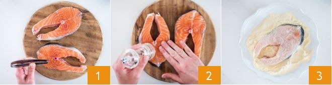 To prepare pan-fried salmon with dill and sour cream, first take care of cleaning the fish and remove all the bones with kitchen tweezers 1. Salt the salmon steaks on both sides and massage with your hands 2, then coat them in flour on both sides 3.