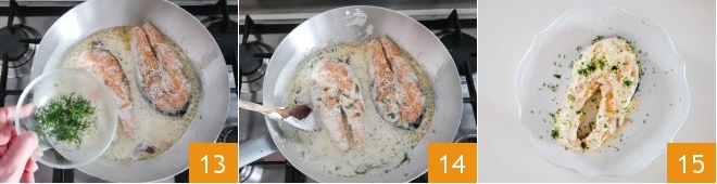 Add the chopped dill 13, then lower the heat and cook for another 5 minutes with the lid on so the sauce thickens and the fish absorbs the flavors 14. After this time, turn off the heat and serve your salmon with dill and sour cream immediately 15!