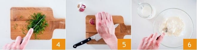 Wash and chop the dill 4, then crush the garlic cloves without peeling them, pressing with the flat side of a knife blade 5. Finally, mix the milk with the sour cream and work the mixture with a fork 6.