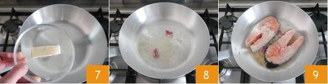 Melt the butter in a large pan 7 and add the garlic cloves in their skins. When the butter starts sizzling 8, place the salmon steaks and sear them over high heat 9