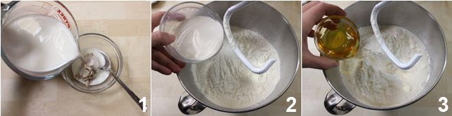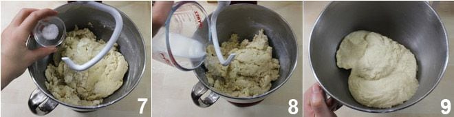 Finally, add the salt 7 and the remaining milk gradually 8, kneading for at least 7-8 minutes, until the dough is smooth and homogeneous 9. Put the dough in a bowl, cover with a clean cloth, and let it rest for at least a couple of hours in an off, closed oven with the light on.