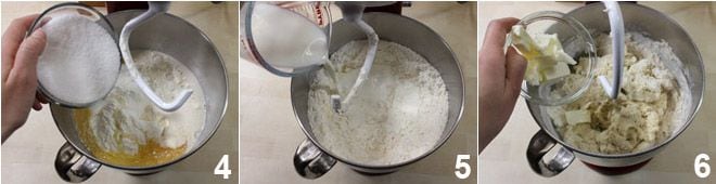 Also add the sugar 4 and 1 1/2 cups of milk 5 and work the dough for about 3 minutes at low speed. Then add the softened butter at room temperature 6 and increase the hook speed to medium, so that the dough absorbs the butter well.