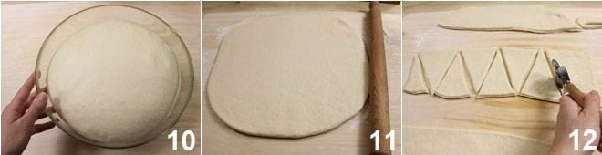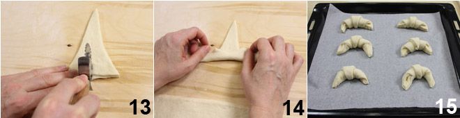 Make a small cut at the base of each triangle 13 and, grabbing the sides, roll the triangle onto itself 14. Thus, form all the croissants and place them on a baking sheet lined with parchment paper 15 and let them rise for another 40-50 minutes, in an off, closed oven.