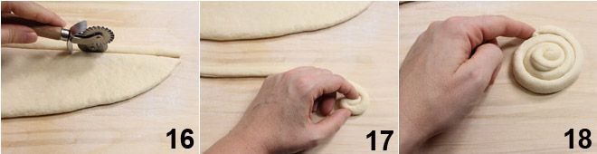To form the snail shapes instead, cut strips 3/4 inch wide from the rolled-out dough 16 and roll them into spirals (17-18). Arrange these also on a baking sheet with parchment paper and let them rise for 40-50 minutes.