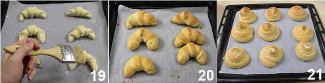 Beat the egg with milk and after the second rise time, glaze the morning breads by brushing them with a brush 19; if you want, sprinkle the surface of the croissants or snail shapes with sugar granules. Bake the morning breads in a preheated static oven at 356°F for 20 minutes, taking care to place a bowl of water at the bottom of the oven. Once the shapes are nicely golden (20-21), remove them and let them cool on a wire rack, so they can cool evenly. Your morning breads are ready: dust them with powdered sugar and fill as desired!