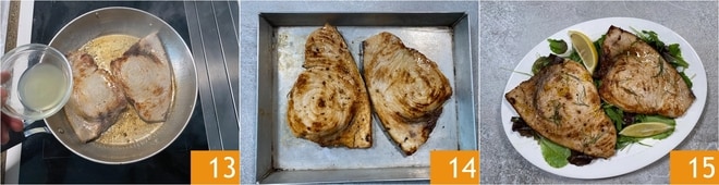 Deglaze with white wine 13 and cook for another 2 minutes, letting the alcohol evaporate completely. Once cooked 14, serve your pan-seared swordfish immediately, accompanied by a mixed salad and some lemon slices 15!