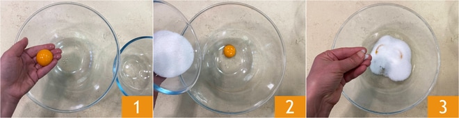 To prepare the coffee pancakes, first separate the egg yolk from the white 1 and set aside the latter. Add the sugar 2 to the yolk, a pinch of salt 3, and mix with a whisk.