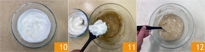 Once whipped to stiff peaks 10, incorporate it into the coffee mixture 11, gently folding from bottom to top to avoid deflating it 12.
