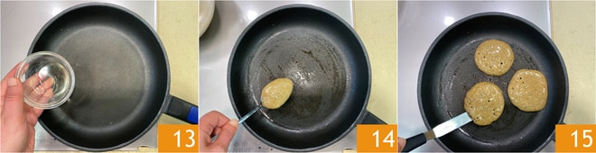 Grease a non-stick pan with seed oil 13, drop spoonfuls of batter into the pan 14, and cook for 2-3 minutes, until bubbles appear on the surface 15.