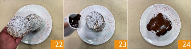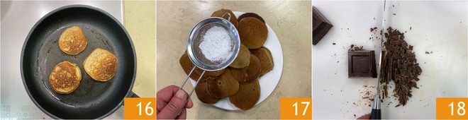 Flip the pancakes and finish cooking on the other side 16. Transfer them to a serving plate and dust with powdered sugar 17. For the accompanying sauce: chop the dark chocolate with a knife 18 and heat the cream in a saucepan.