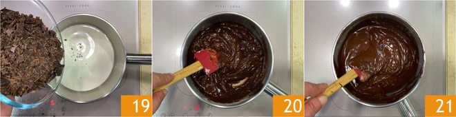 Pour the chocolate into the hot cream 19 and stir to melt it 20 until you obtain a smooth sauce 21.