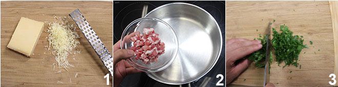 To prepare the savory herb pancakes, start by coarsely grating the Gruyère cheese 1 and set it aside. Brown the bacon cubes in a non-stick pan without adding any fats 2 and let them brown over low heat, then drain them from excess fat and set aside. Chop the herbs separately: chives, basil, and parsley 3.