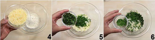 In a bowl, put the sifted flour and baking powder, and add the grated cheese 4 and the chopped herbs one by one: parsley, chives, and basil (5-6).