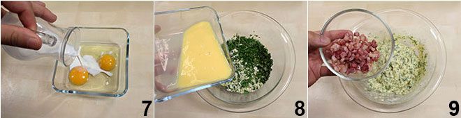 In a separate small bowl, beat the eggs with the milk 7 and add the obtained liquid to the bowl containing the rest of the dry ingredients 8. Mix well until a soft and homogeneous mixture is obtained, add the browned bacon cubes 9, salt and pepper, and mix one last time.