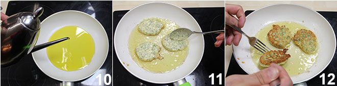 In a small non-stick pan, put 2 tablespoons of extra virgin olive oil 10 and heat it over the stove: take 3 spoonfuls of batter at a time and place them in the pan 11, forming 3 pancakes that you will cook on both sides until they become golden brown 12. Remove the pancakes from the pan, drain them on absorbent paper, and keep them warm; put another tablespoon of olive oil in the pan and fry the remaining pancakes in the same way.
