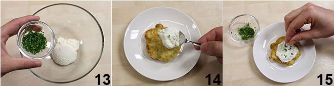 Prepare the cream to accompany the savory pancakes by mixing the sour cream (or Greek yogurt) and half a tablespoon of chopped chives 13, salt, and pepper evenly in a small bowl. Serve the savory herb pancakes with a spoonful of cream on each 14 and a sprinkle of leftover chives 15.