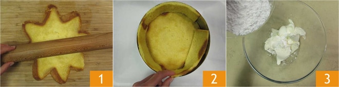 To prepare the Pandoro and Nutella® cake, roll out the pandoro slices with a rolling pin to about 1/5 inch 1. Cut one of them with a 7-inch ring, place the same ring on a tray lined with parchment paper. Place the cut slice inside to serve as the base. Cut the other rolled-out pandoro slice into strips about 2 inches wide, trim the uneven ends to even them out and line the edge of the ring with them 2. To fill: soak the gelatin in cold water for at least 10 minutes. In a bowl, pour the mascarpone and powdered sugar 3.