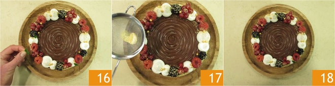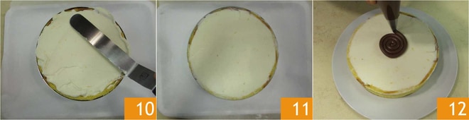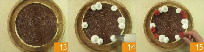 and level the surface with a spatula 10. Transfer the cake to the refrigerator for at least 2 hours. Once set 11, start decorating with Nutella® placed in a pastry bag with a ribbed nozzle: create a spiral to cover the entire surface, starting from the center and making concentric circles 12.