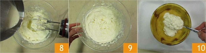 Pour everything onto the mascarpone cream 8 and mix for a few seconds with the electric mixer. Once ready 9, pour the mascarpone and cream mixture into the mold 10