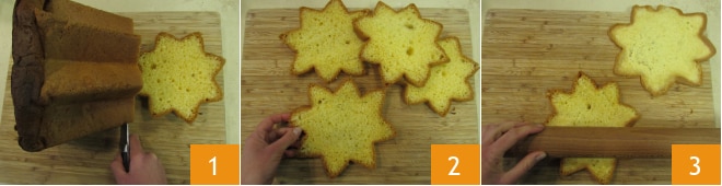 To prepare the pandoro ring with Nutella®, start by cutting the first 2 inches of the pandoro that you won't need 1. Then make 4 slices each 0.6 inches thick 2 and flatten 2 of them with a rolling pin 3,