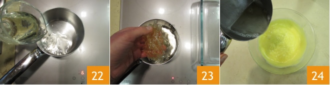 Meanwhile, place a small saucepan on the stove and heat the sparkling wine 22, then retrieve the gelatin, pour it into the sparkling wine, and dissolve it off the heat 23. Pour it into the cream 24.