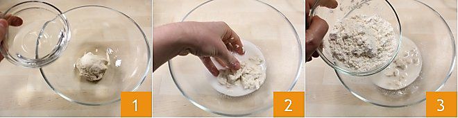 To prepare 'pane cafone', you will need to make 3 different doughs. Let's start with the first: take 2.5 oz of your sourdough starter (Sourdough starter from GialloZafferano), or get the sourdough from your trusted bakery, and place it in a bowl along with the water 1. Dissolve the yeast with your hands 2, then gradually add the all-purpose flour 3 and