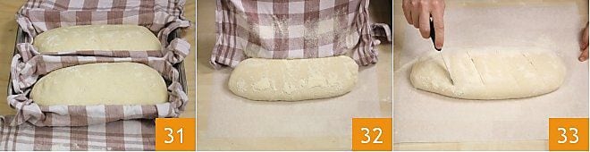 After this time, the loaves will be well swollen and ready for baking 31. Preheat the static oven to 464°F, leaving the baking sheet inside on which the loaves will bake (it is recommended, for those who have it, to place a baking stone at the bottom of the oven instead of the baking sheet), which should be very hot. If you have a convection oven, set the temperature to 428°F. Grabbing the edges of the cloth, flip a loaf at a time onto a sheet of parchment paper 32: don't touch the bread too much, or it will deflate! Using a smooth and very sharp knife, make diagonal cuts 33. You can also choose not to cut it if you prefer.