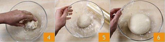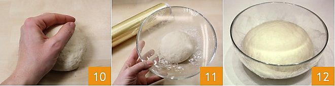knead until you obtain a smooth and homogeneous dough, which you will shape into a ball 4. Let this first dough rise for at least 3 hours in the bowl, lightly floured, covered with plastic wrap, in the turned-off oven with the light on. The initial volume should double after the time has passed 6.